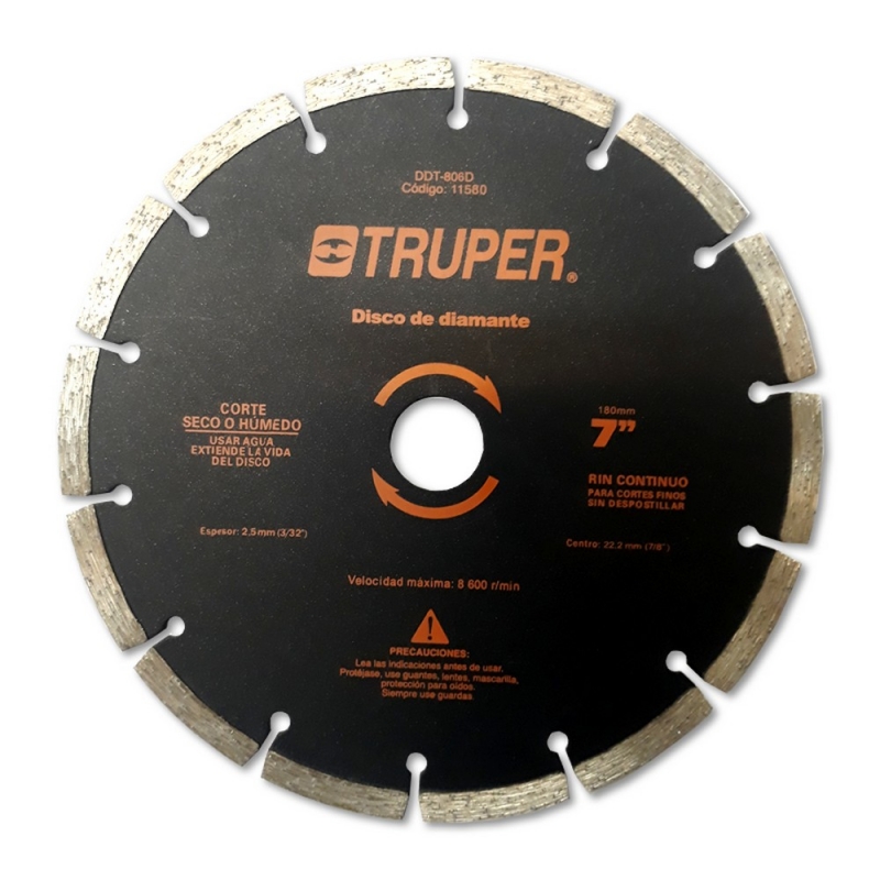 Descripción Eje 7/8", 6.700 RPM. Espesor 2,7mm. Rin segmentado. Corte seco o húmedo, incluye 2 reductores de acero. Para cortes rápidos en concreto, block, ladrillo, piedra y materiales de construcción. No se recomienda para loseta o mármol por su acabado burdo