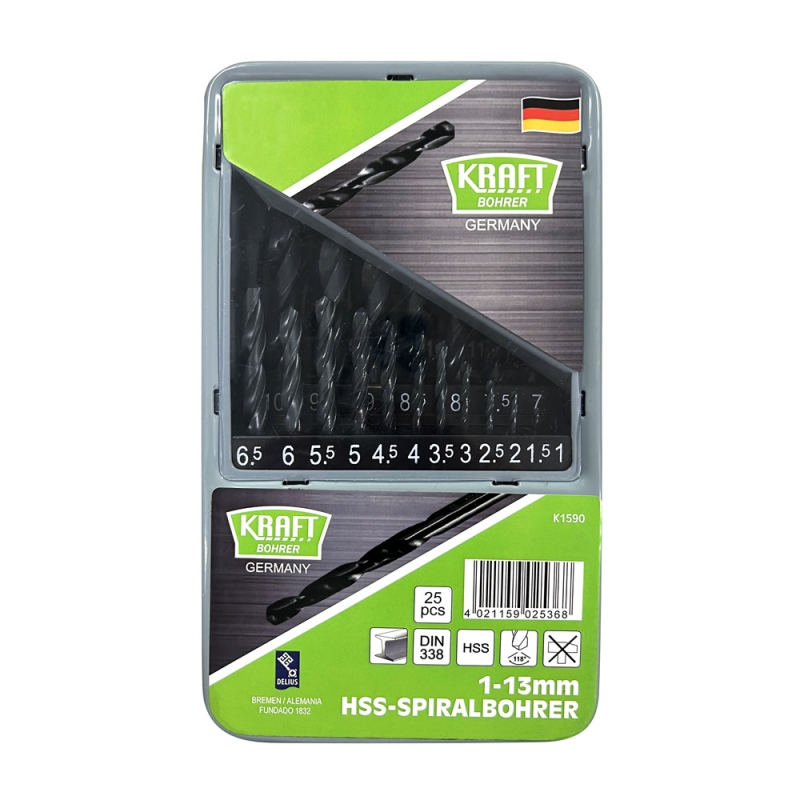 Contenido: 1 - 1,5 - 2 - 2,5 - 3 - 3,5 - 4 - 4,5 - 5 - 5,5 - 6 - 6,5 - 7 - 7,5 - 8 - 8,5 - 9-9,5 - 10 - 10,5 - 11 - 11,5 - 12 - 12,5 - 13 mm Material: Acero Rápido HSS Usos: Metales como aluminio, cobre, latón y Bronce y para materiales no ferrosos. Norma: DIN338 Dureza: 60-62HRC - Broca helicoidal de acero de corte rápido de alto rendimiento según DIN 338, laminada por rodillo, cilíndrica, de corte a la derecha, tipo N. - Afilado de superficie cónica de 118°. - Superficie negra - Adecuada para taladrar acero, metales NF, fundición de acero aleado y sin alear. Hasta 900 N/mm² de resistencia a la tracción.