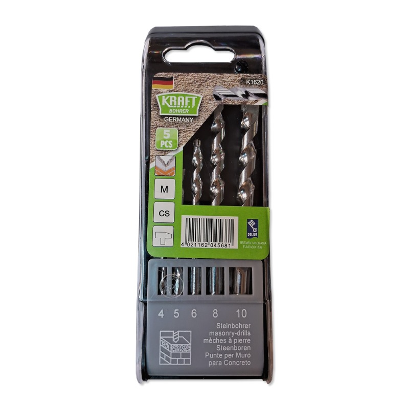 Descripción BROCA CONCRETO KRAFT BOHRER GERMANY JGO. 5 PZAS. 4-5-6-8-10 MM Para concreto Contenido: 4x75 - 5x85 - 6x100 - 8x120 -10x120 mm