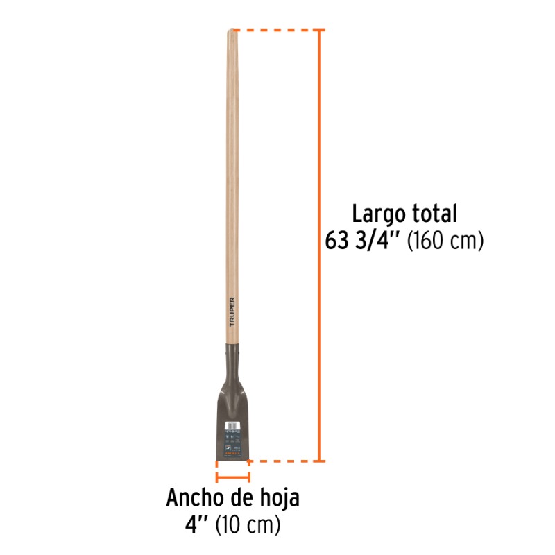 Descripción RASPADOR TRUPER HOJA 4" C/MANGO LARGO 54" # SCR-4 (18650) Cabeza acero, Mango madera de fresno. Para levantar recubrimientos cerámicos, loseta asfáltica o vinilíca, impermeabilizantes y residuos de yeso y cemento, rompe hielo, troza raíces.
