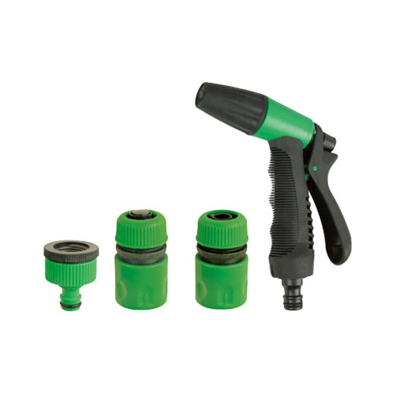 DescripciónPistola riego plástica con unión, acople con stop, acople sin stop, unión llave. Para manguera 1/2"