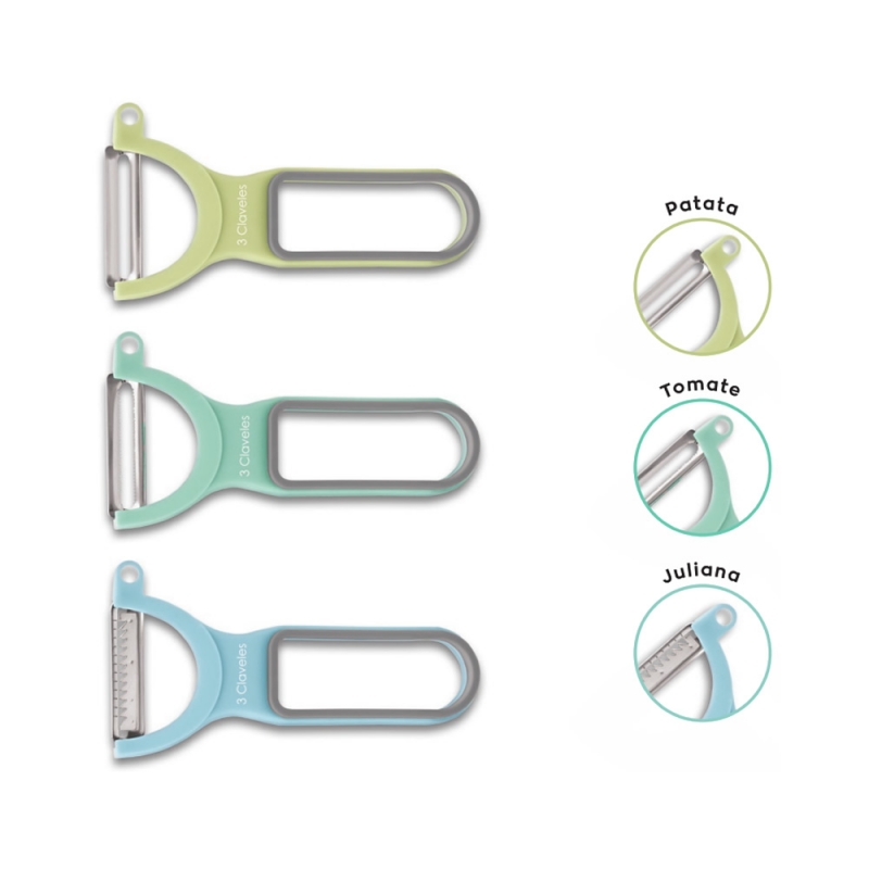 Descripción PELADOR TRES CLAVELES # 4623 (4622) PACK DE 3 PZAS. Pack de 3 peladores con cuchillas diferentes, especialmente indicados para patata , tomate y juliana.