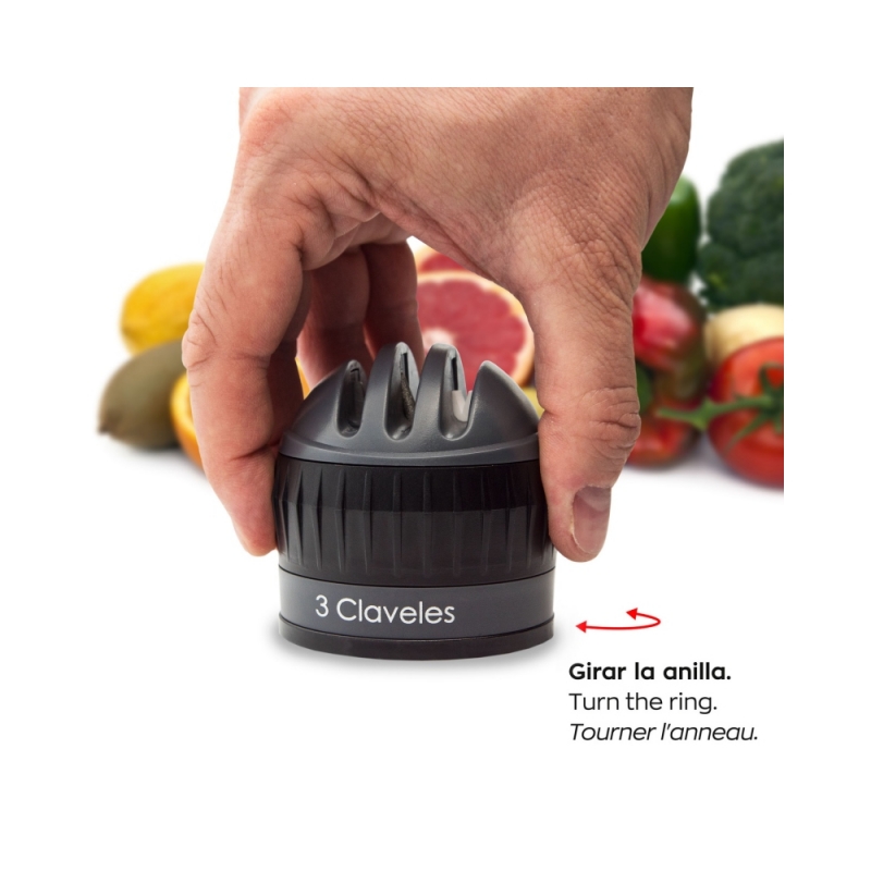 AFILADOR DE CUCHILLO TRES CLAVELES # 9427 3 PASOS C/VENTOSA Afilador cuchillos 3 pasos con ventosa Mucho más seguro y cómodo para afilar con una mano Barras con recubrimiento de diamante (preparación del afilado) Placas de carburo de tungsteno (afilado grueso) Placas cerámicas (afilado fino)