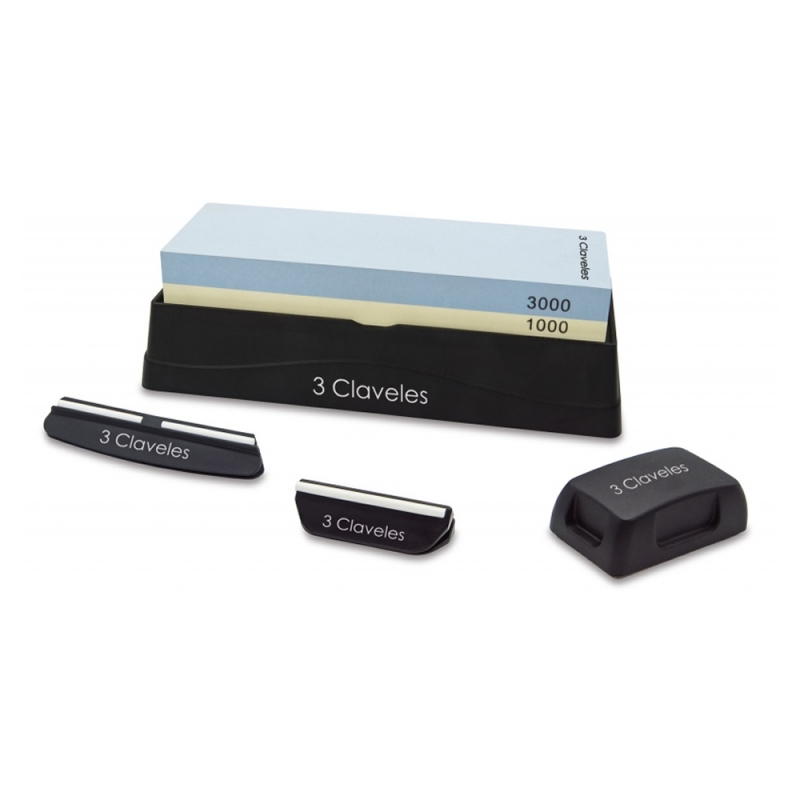 PIEDRA AFILAR CUCHILLOS TRES CLAVELES # 9428 C/2 GUIAS Y RECTIFICADOR Piedra afilar 1000/3000 al agua Dos caras: afilado grueso y fino Base antideslizante para un afilado seguro 2 Guías de Afilado: para cuchillos pequeños y grandes Reparador para limpiar y alisar la piedra Almacenaje interno.