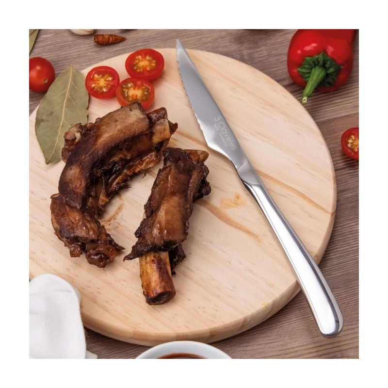 CUCHILLO TRES CLAVELES # 1515 INOX DENTADO CHULETERO 11 CMS - Cuchillo de mesa chuletero monoblock en acero inoxidable. - Con el filo dentado que facilita el corte de filetes y carne ligeramente asada sin esfuerzo. - Mango en formas redondeadas para la comodidad en su manejo. - Apto para el lavavajillas. - De 11 cm. - Cubiertos con elegancia.