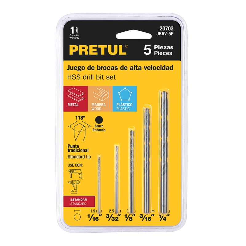 BROCA PRETUL (TRUPER) JGO. 5 PZS # JBAV-5P Para usarse en acero, madera y plástico Composición : 1/16" - 3/32" - 1/8" - 3/16" - 1/4" Broca de alta velocidad, fabricada en acero M-2 Ángulo punta 118º uso industrial precisión, alta resistencia al desgaste