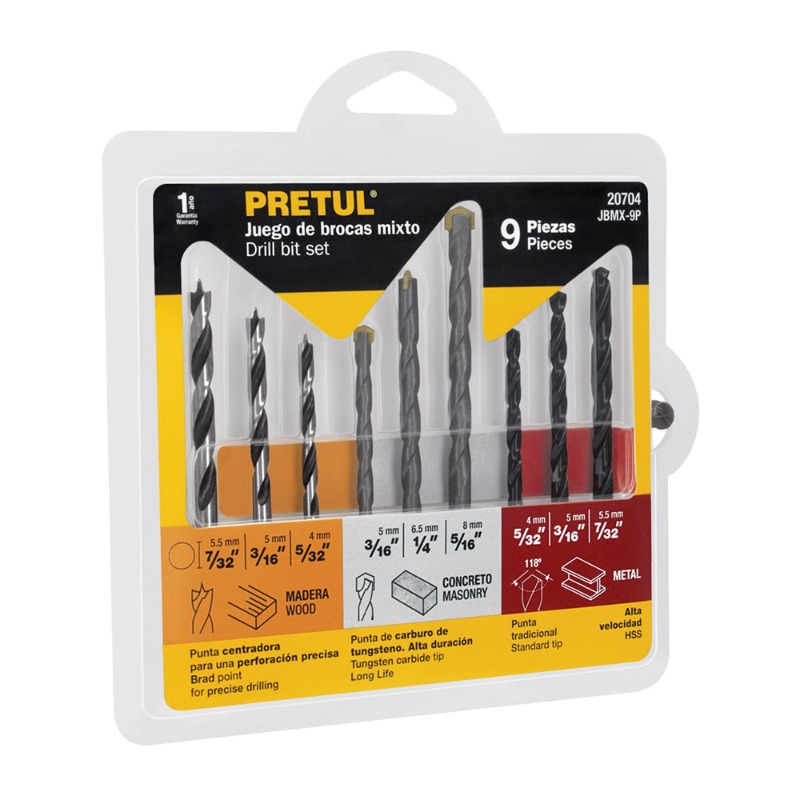 Descripción BROCA PRETUL (TRUPER) JGO. 9 PZS. # JBMX-9P - 3 Brocas de acero M-2 para metal : 5/32" - 3/16" - 7/32" - 3 Brocas de acero SAE-5140 para concreto: 3/16" - 1/4" - 5/16" - 3 Brocas de acero SAE-1040 para madera: 5/32", 3/16", 7/32"
