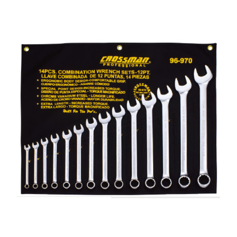 Descripción LLAVE P Y C CROSSMAN # 96970 3/8" - 1.1/4" 14 PZ. Medidas: 3/8” - 7/16” - 1/2” - 9/16” - 5/8”- 11/16” - 3/4” - 13/16” - 7/8” - 15/16” - 1” - 1.1/16” - 1.1/8” - 1.1/4” Cromo vanadio