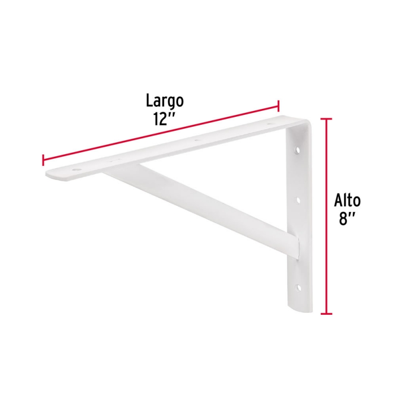 Descripción ESCUADRA ESTANTE TRUPER REFORZADA BLANCA # MER-12B 8" X 12" Fabricadas en acero. Acabado con pintura electrostática. Reforzadas con soporte transversal para mayor capacidad de carga. Carga máxima 225kg