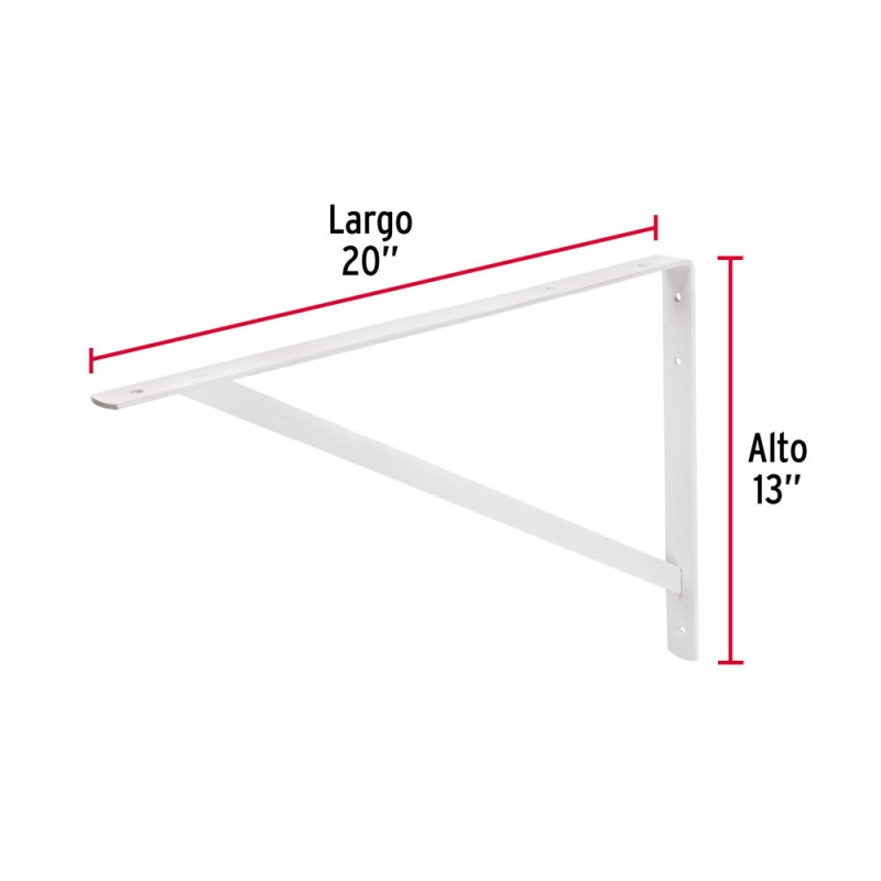 Descripción ESCUADRA ESTANTE TRUPER REFORZADA BLANCA #MER-20B 13" X 20" Fabricadas en acero. Acabado con pintura electrostática. Reforzadas con soporte transversal para mayor capacidad de carga. Carga máxima 125kg