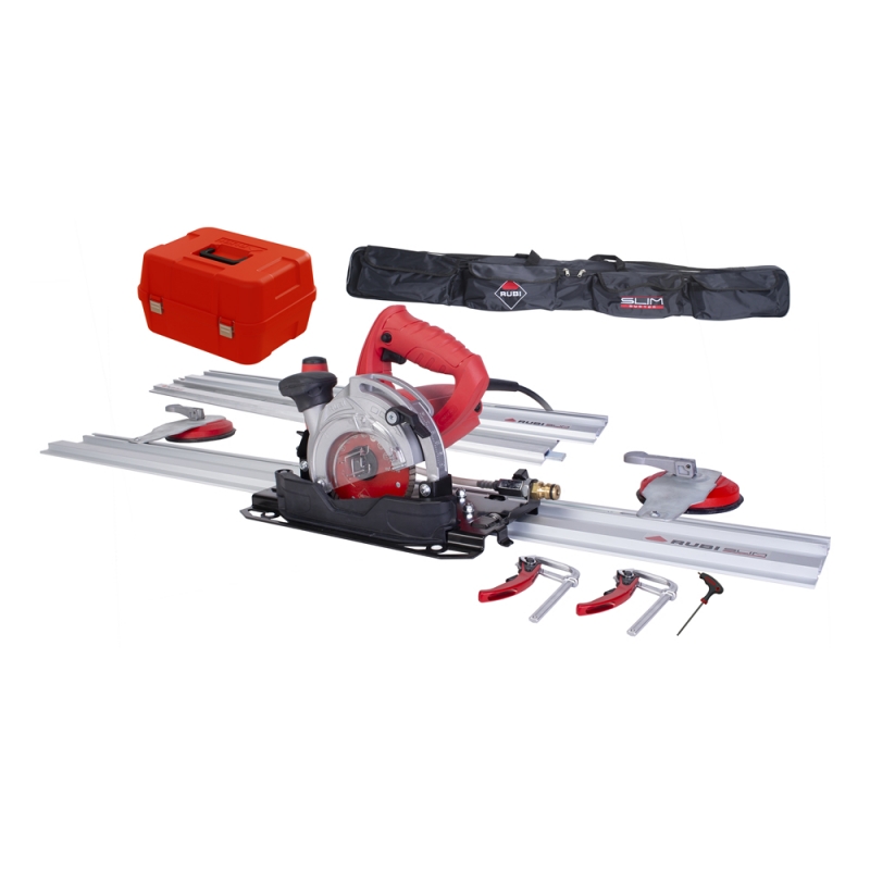 CORTADORA CIRCULAR CERAMICA Y BALDOSA RUBI #51951 (51953)- TC-125 C/3 GUIAS Cortadora circular electro-portátil. Apta para el corte en seco o corte húmedo, doble sistema de reducción/control de polvo, para el corte de todo tipo de baldosa, cerámica, lámina cerámica, piedra natural y piedra sinterizada. Indicada para piezas de gran formato, cabezal de corte regulable en altura y abatible de 0° a 45° (inglete). Incluye: - Disco TCR-125 SUPERPRO (corte seco) - 3 guías SLIM CUTTER 110cm - 2 Ventosas para superficies rugosas - 2 Pinzas de fijación - Bolsa textil y maleta de transporte Potencia: 1,7 CV (P1: 1,25kw) 13800RPM Diámetro exterior de disco: 115/125 mm Diámetro interior de disco: 22,2 mm Espesor máximo corte: 20 mm (para discos 115) y 25mm (para discos 125) Espesor máximo corte a inglete: 14 mm (discos 115) y 18 mm (discos 125) Peso neto: 4,8 kg. (sólo máquina con disco de serie) Peso con maleta-estuche - 14 kg Conexión directa a aspiradora AS-30 PRO (Ø32mm), Incluye adaptador para otros modelos y marcas (Ø37, 42 y 50 mm) Válvula de regulación y conexión rápida para manguera (Ø16 mm) Tapón de goma para la salida de aspiración Cable eléctrico con PRCD (diferencial) Protector de disco de aluminio inyectado con tapa de policarbonato Protector lateral basculante para el corte a inglete