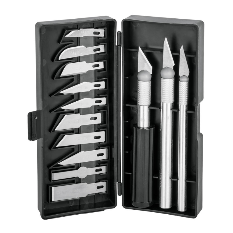 Descripción CUCHILLO PRECISION PRETUL (TRUPER) JGO. 13 PZS. #EXA-13P Para diseño, arte, artesanías, maquetas, etc.. 13 cuchillas de acero SK5. Mangos metálicos para uso ligero, medio y pesado