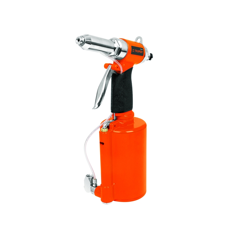 6 Boquillas intercambiables de 3/32”, 1/8”, 5/32”, 3/16”, 7/32" y 1/4". 2 Llaves, 1 Cilindro, 2 Mordazas, 1 Guarda protectora, 1 Ensamble de impulsor. Sistema auxiliar de vacío para una mejor sujeción del remache en cualquier posición. Válvula universal giratoria. Presión de trabajo 80-100 PSI