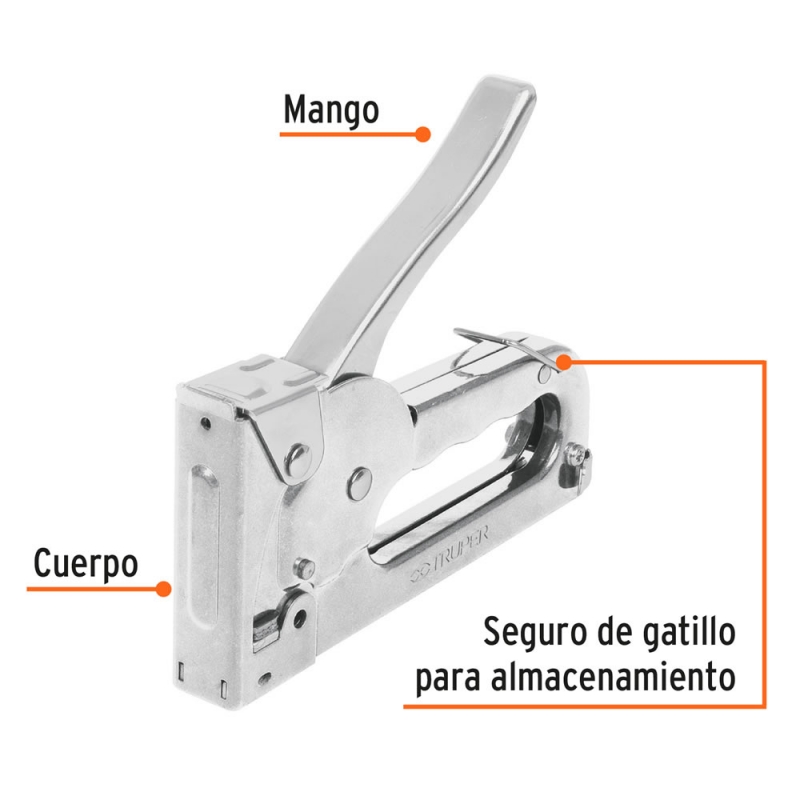 Descripción ENGRAPADORA TRUPER TRABAJO LIVIANO # ET-19 Tipo pistola, uso ligero, para Grapas de 1/4 y 5/16" Incluye 200 grapas 5/16"