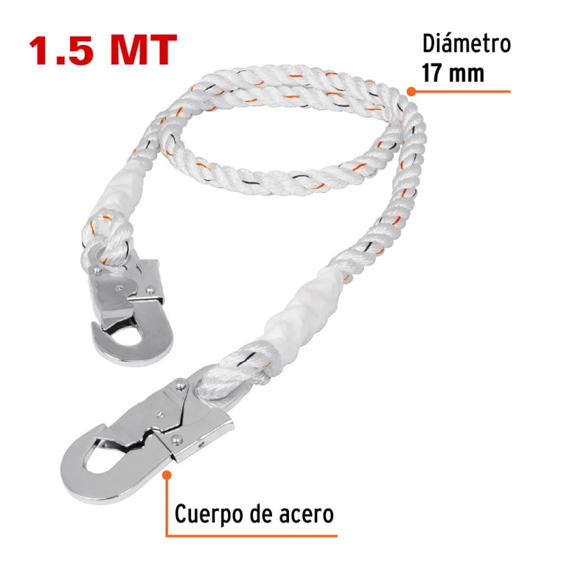 CUERDA DE SEGURIDAD TRUPER 1,5 MT. 2 GANCHOS #CAB-5489-15 Cinta 100% poliéster que brinda alta tenacidad 2 Ganchos de acero forjado con mecanismo de doble bloqueo con una resistencia a la tensión de 5000 lb. Para conectarse a los anillos "D" laterales y limitar el movimiento. Para uso con arnés de posicionamiento. Para la industria en general y construcción.
