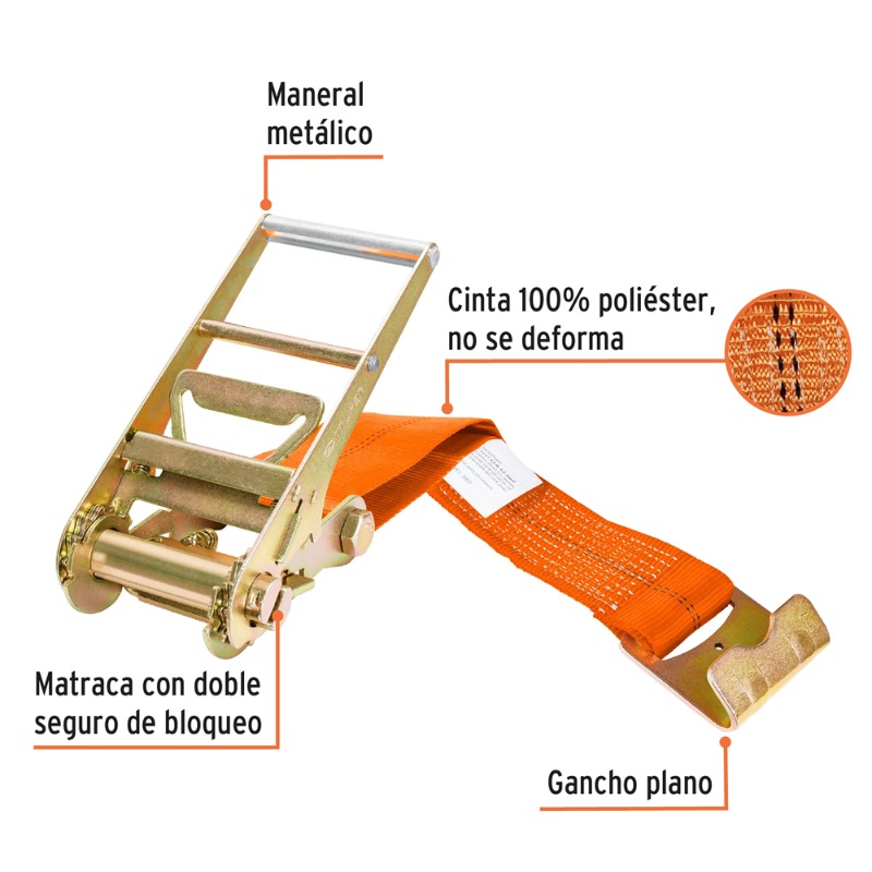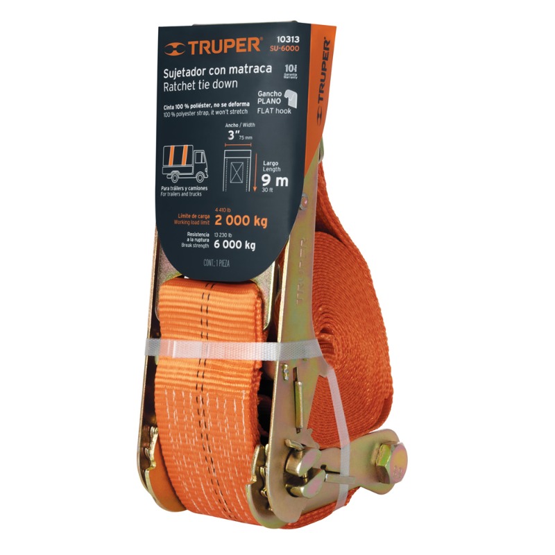 ESLINGA TRUPER 9 MT X 3" CARGA MAXIMA 6.000 KG. # SU-6000 Carga trabajo 2000 kg Carga máx. 6000 kg Cinta 100% poliéster, no se deforma Gancho plano y maneral metálicos con recubrimiento tropicalizado resistente a la corrosión Doble seguro de bloqueo que mantiene la matraca en posición cerrada