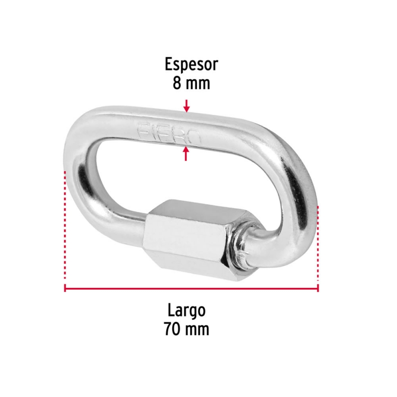Descripción ESLABON RAPIDO FIERO (TRUPER) 5/16" #BSE-5/16 (BANSE-5/16) Fabricados en acero al carbono Para arrastre, sujeción y anclaje Conexión rápida a cadenas cables y accesorios Carga de trabajo 800kg