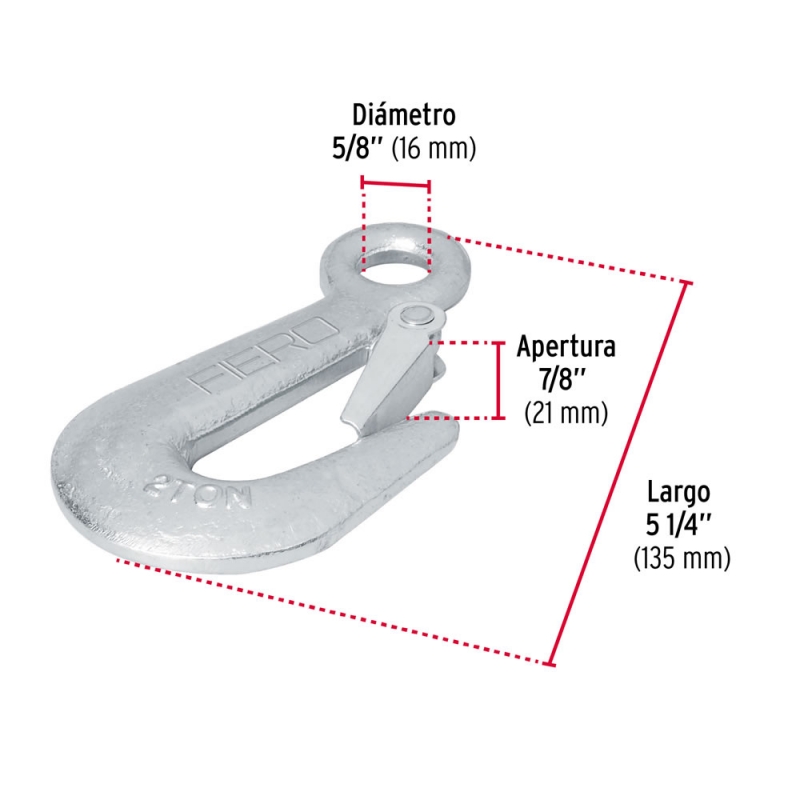 Descripción GANCHO TRUPER C/SEGURO 5/8" CARGA MAX. 2.000 KG #GANES-5/8XX Seguro de resorte de enganche rápido, acabado galvanizado Carga de trabajo 2000kg