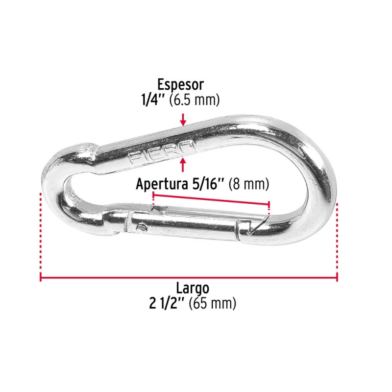 Descripción MOSQUETON FIERO (TRUPER) FIJO ACERO 1/4" #BMA-1/4 (BANMOS-1/4) Largo 64mm, límite carga 120 kgs Ideales para conexiones de cables y cuerdas