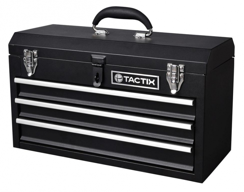 Descripción CAJA HERRAMIENTAS TACTIX #321102 METAL.T/GABINETE PORTABLE 52 CM Construcción totalmente de acero Asa, pestillos de acero de alta resistencia con pernos de tracción, bisagra de piano de longitud completa. Incluye bandeja de metal
