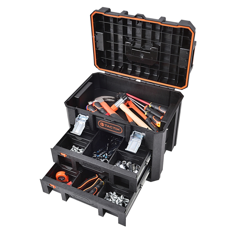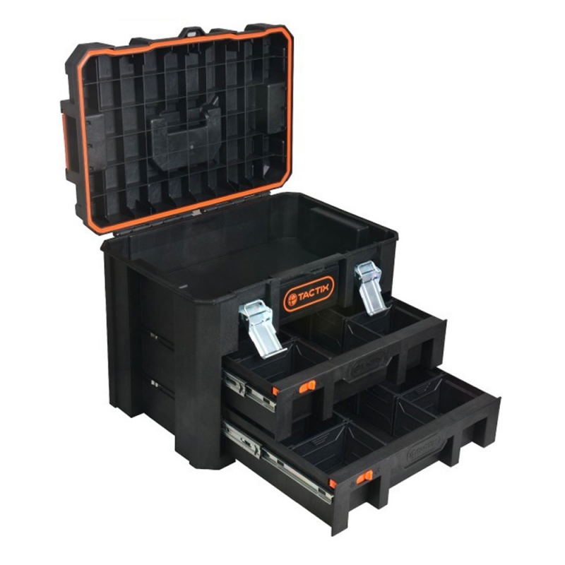 Descripción CAJA HERRAMIENTAS TACTIX #320362 C/2 CAJONES DIVISORES 37,1X52,8X39,9 CM - Caja de almacenamiento con espuma estructural durable. - Capacidad 78 lts aprox - Pestillos de acero bloqueables - Manija de agarre suave - 2 cajones con seguro y separadores removibles