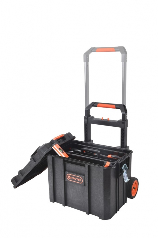 Descripción CAJA HERRAMIENTAS TACTIX #320365 C/RUEDAS-2 C/ BANDEJA 37,1X56,2X41,2 CM. Caja de almacenamiento de espuma estructural durable, pestillos de acero Enclavamientos laterales entrelazados para conectar unidades adicionales Manija extensible 78 lts aprox
