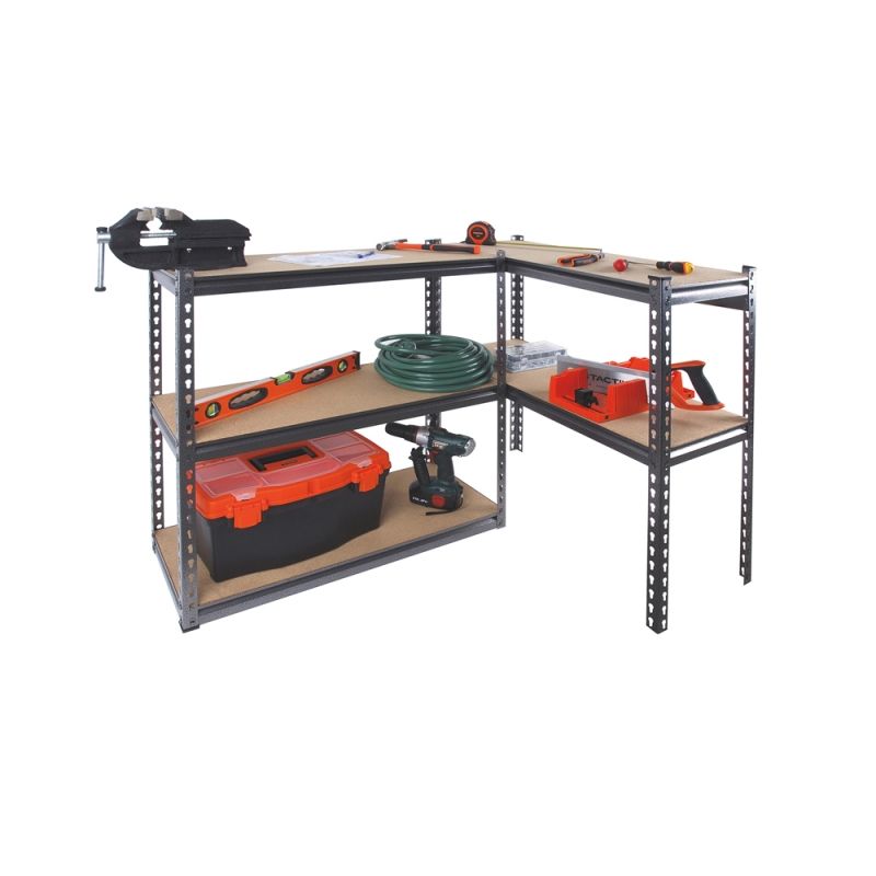 Descripción ESTANTE METALICO TACTIX #329016 86,5 X 35,5 X 183 CMS. - Diseño de ensamblaje sin tornillos - Perfecto para almacenar cargas pesadas en el garaje o almacén - 5 bandejas de madera
