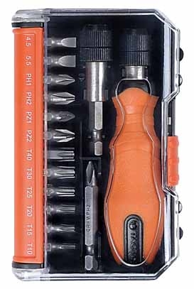 Descripción Punta Paleta: 4,5 - 5,5 mm Punta Cruz : PH1 - PH2 - PH2 LARGA Punta Pozidriv: PZ1 PZ2 Punta Torx : T10 T15 T20 T25 T30 T40 Mango y adaptador , estuche plástico