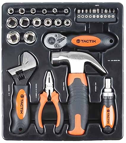 Descripción Llave Francesa 2 en 1 - Alicate Univ 4.1-2" - Martillo Stubby 10oz - Mango Adaptador - Llave Chicharra - Dados SH: 4 - 4,5 - 5 - 6 - 7 - 8 - 9 - 10 - 11 - 12 - 13 - 14 - 15 - 17 mm Puntas : T15 T20 H3 H6 PH1 PH2 PH3 - Carp. 4, 5, 6 mm