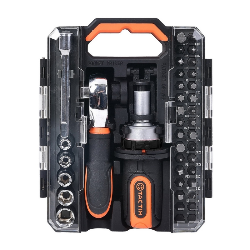 Descripción Punta Cruz: #0 #1 #1 #2 #2 #3 #3. Punta Paleta: 3 - 4 - 5 - 6 - 7 mm. Punta PZ: PZ1 - PZ2 PZ2 - PZ3. Punta Hex: 2 - 2,5 - 3 - 4 - 5 - 6mm. Punta Torx: T10 T15 T20 T25 T27. Punta cuadrada: #0 #1 #2 #3. Dados SH 1/4" Dr: 4 - 5 - 6 - 8 - 10mm. Destornillador trinquete stubby. Chicharra 1/4"Dr - Extensión 1/4"Dr x 75mm - Adaptador 1/4"Dr