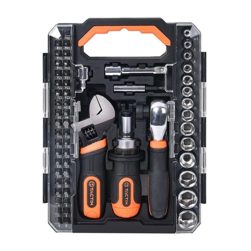 Descripción Punta Cruz: #0 #1 #2 #2 #3. Punta Paleta: 3 - 4 - 5 - 6 - 7mm. Punta PZ: PZ0 PZ1 PZ2 PZ2 PZ3. Punta Cuadrada: #0 #1 #2 #3. Punta Hex: 2 - 3 - 4 - 5 - 6mm 3/32" 1/8" 5/32" 3/16" 1/4". Punta Torx: T10 T15 T20 T25 T27 T30. Dados 1/4" SH: 4 - 4,5 - 5 - 6 - 7 - 8 - 9 - 10 - 11 - 12 mm. Dados 3/8" SH: 13 - 14 - 15 - 16mm. Adaptador: 3/8"(F) x 1/4"(M). Extensión 3/8"Dr x 75mm. Portapunta magnética 60mm. Destornillador trinquete stubby. Llave ajustable 6". Chicharra dual 1/4"Dr y 3/8"Dr