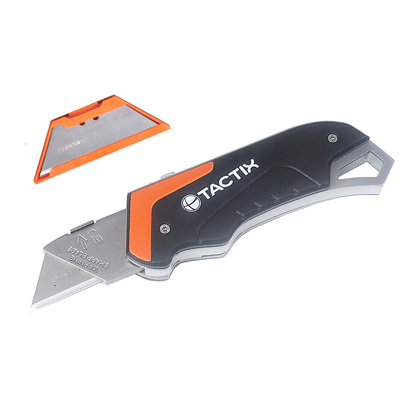 Descripción CUCHILLO CARTONAJE TACTIX # 261223 HOJA RETRACTIL C/5 HOJAS REPTO. Diseño retráctil, mecanismo de bloqueo de seguridad. 5 hojas SK5 incluidas