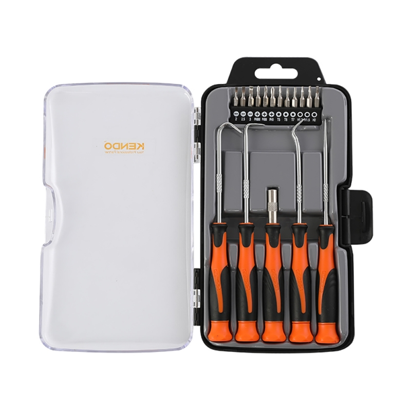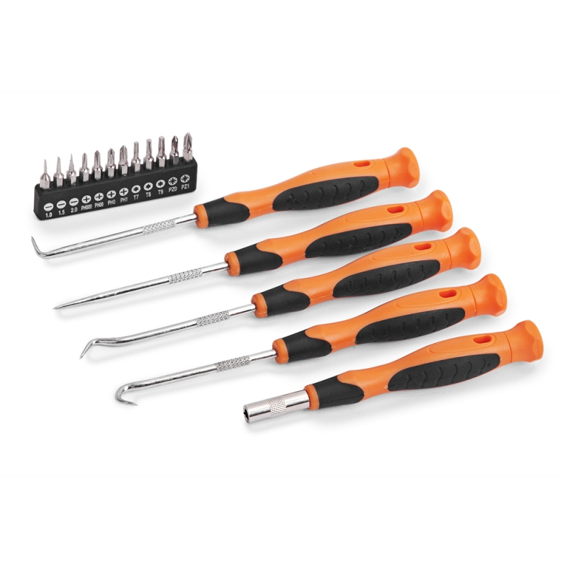 Descripción Punta Cruz: # 000 - # 00 - # 0 Punta Paleta: 2,0 - 2,5 - 3,0 mm Punta Torx: T5 - T6 - T7 Punta Hexagona: H1,3 H1,5 H2,0 mm 4 Ganchos de extracción de o"rings: ángulo - recto - extendido - ángulo 90º 1 Mango adaptador