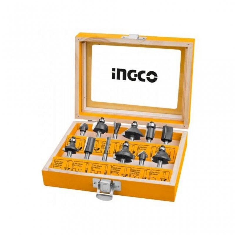 FRESAS INGCO 8MM JGO.12 PZAS AKRT1211 Embalado en caja de madera contrachapada 3 Broca recta: 6 mm, 12 mm, 16 mm 1 Broca de 1/2 " de ranura en V de 90° 1 Broca de cola de milano de 1/2" 1 Broca 32mm 45 ° de chaflán 1 Brocas de corte al ras de 1/2" 1 Broca de núcleo de 1/4" 1 Broca de caja de núcleo de 1/4" 1 Broca R-4 ojival romana 2 Brocas punta redonda de esquina: 1/4 ", 3/8"