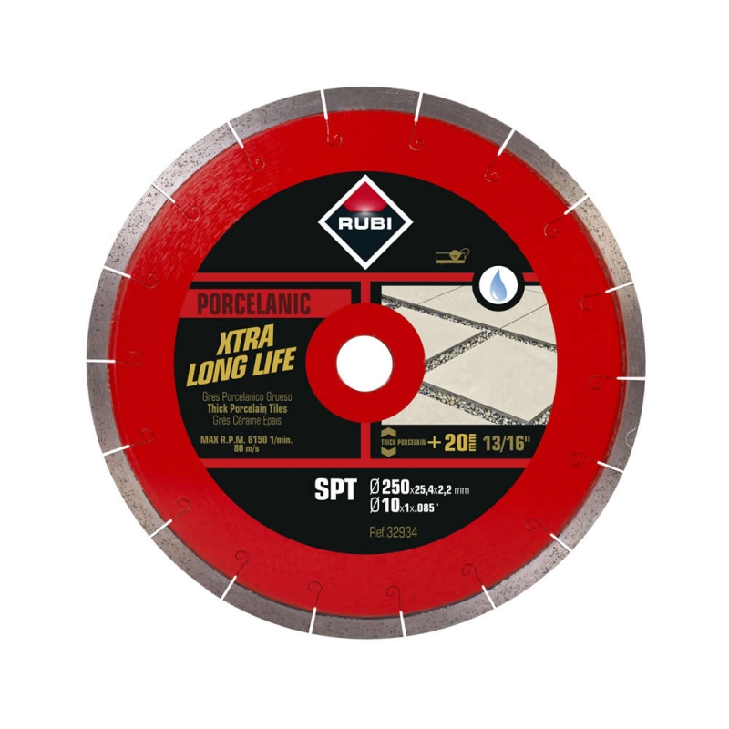 DISCO DIAMANTE RUBI #32934 SEGMENTADO SPT 250 MM PREMIUM Para el corte de baldosas de gres porcelánico con espesores de 20mm, pueden trabajar con espesores de hasta 35 mm y materiales tan variados como la piedra natural o la piedra sinterizada 6.150 RPM