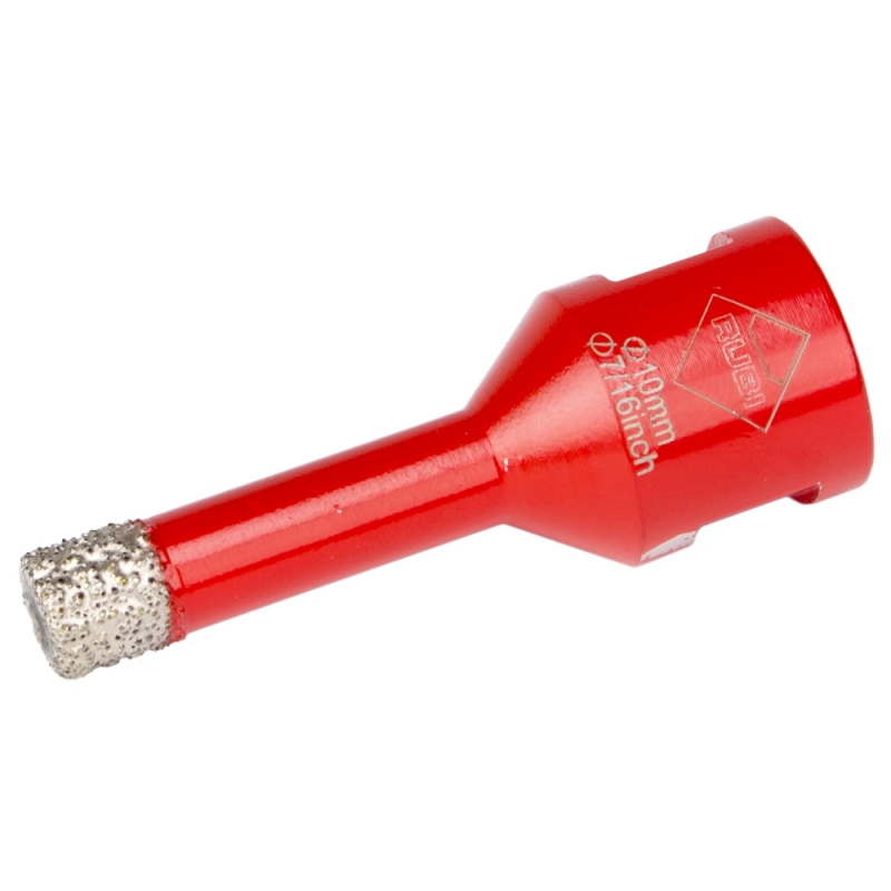 BROCA DIAMANTE RUBI DRYGRES 10 MM # 5990 CORTE SECO Recomendable para la perforación de todo tipo de baldosa cerámica, en especial las de gres porcelánico y otros materiales de revestimiento como el mármol y el granito. Conexión con rosca M14 Profundidad de perforación 36mm 14000RPM Utilizables con amoladora (conexión directa) o taladro eléctrico sin percutor (adaptador ref. 05976) Envasadas en blister