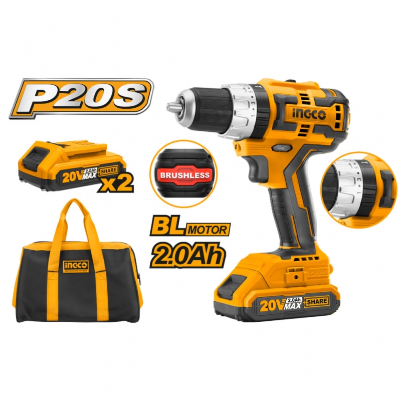 TALADRO PERCUTOR INGCO INALAMBRICO 20V #CIDLI20608 (C) Motor sin escobillas Engranaje mecánico de 2 velocidades 2 baterías litio 2.0 Ah 1 cargador rápido (2amp x hr) Bolsa de lona Luz de trabajo integrada Indicador LED de carga de batería VELOCIDAD SIN CARGA: 0-450/0-1900/min MAX.TASA DE IMPACTO: 22500/MIN. MAX.TORQUE: 60NM CAPACIDAD DE PERFORACION: 0-13 mm AJUSTES DE PAR: 23+1+1 VOLTIOS DE CARGA: 220V-240V~50/60Hz