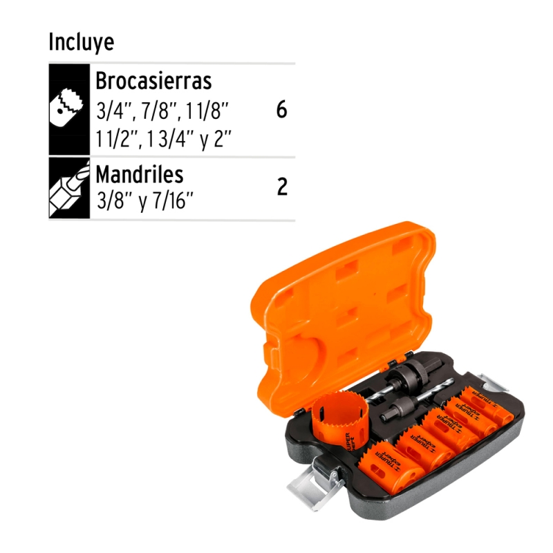 SIERRA COPA TRUPER 8 PIEZAS BIMETALICA # KITB-6 6 Sierras Copa 3/4", 7/8", 1 1/8", 1 1/2", 1 3/4" y 2 1/4" 2 Mandriles 3/8" y 7/16" Sierras Copa bimetálicas 10X mayor durabilidad que las de acero al carbono Dientes de acero alta velocidad Ranura amplia para remover material fácilmente Estuche con broches metálicos