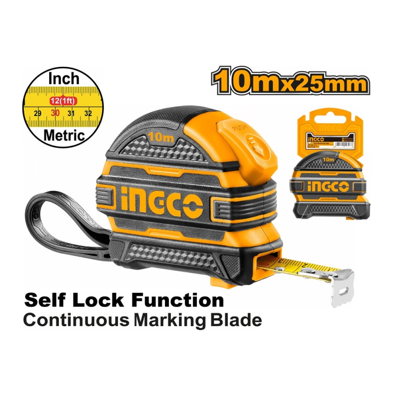 Descripción HUINCHA INGCO METRICA DE ACERO C/AUTOBLOQUEO 10M X25 MM # HSMT081025 Largo y ancho: 10mx25mm Función de autobloqueo Con métrico y pulgadas Botón doble Diseño unico