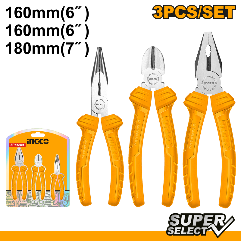 Descripción ALICATE INGCO UNIVERSAL, PUNTA, CORTE DIAGONAL SUPER SELECT JGO 3PZAS # HKPS08311 Alicate Universal 7" Alicate Punta Larga 6" Alicate Corte Diagonal 6"