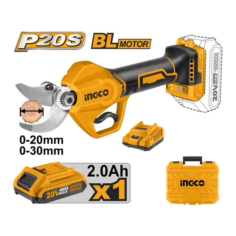 Descripción TIJERA DE PODAR INALAMBRICA INGCO 20V C/BATERIA Y CARGADOR #CSSLI203083 Motor sin escobillas 1 Batería 2,0AH (FBLI2001) 1 Cargador (FCLI2001E) 1 Botella mezcladora 1 Piedra afilar POTENCIA: 20V DIAMETRO DE CORTE: 20 mm/30 mm VOLTIOS DE CARGA: 220V-240V~50/60Hz