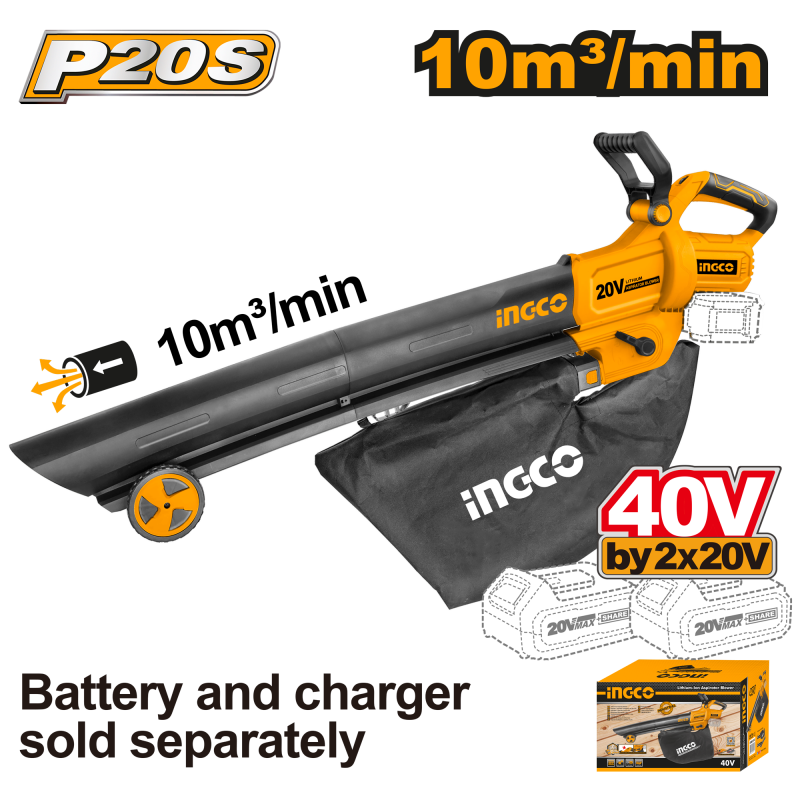 Descripción SOPLADOR ASPIRADOR INGCO INALAMB.40V S/BAT.S/CARGADOR #CABLI2003 Con 1 bolsa para el polvo Batería y cargador NO INCLUIDO VOLTAJE: 40V VELOCIDAD SIN CARGA: 6000-11500rpm VOLUMEN DE AIRE MEDIO: 10m³/min VELOCIDAD MÁX DE AIRE: 190km/h