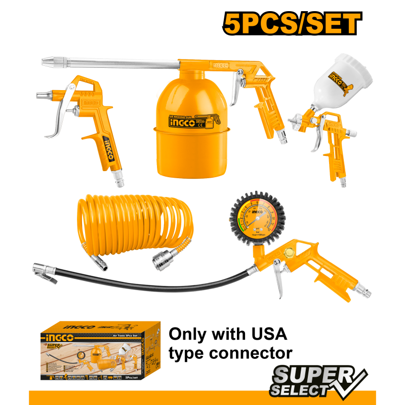 PISTOLA PARA PINTAR INGCO JGO.5 PZAS # AKT0053-1 1 Manguera de retroceso longitud: 4 m, diámetro: 8 mm 1 Pistola de aire comprimido Longitud de la boquilla: 16mm 1 Pistola pulverizadora de aire 600cc Presión de funcionamiento: 3-4bar Ancho del patrón: 180-250 mm 1 Pistola lavado de aire 750cc Presión funcionamiento: 4bar 1 Pistola para inflar neumáticos con conector Nitto Presión máxima: 12bar