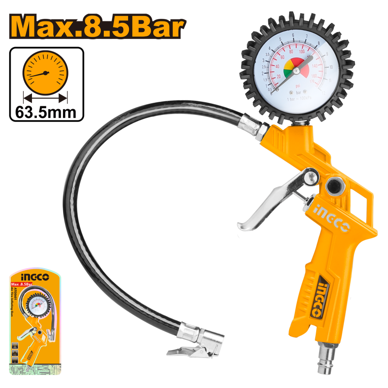 Descripción INFLADOR NEUMATICOS INGCO PROFESIONAL 120 PSI # ATG0601 Presión máxima: 8,5 bar (120 PSI) Con conectores: tipo Europa, tipo USA, tipo Nitto y tipo Italia.