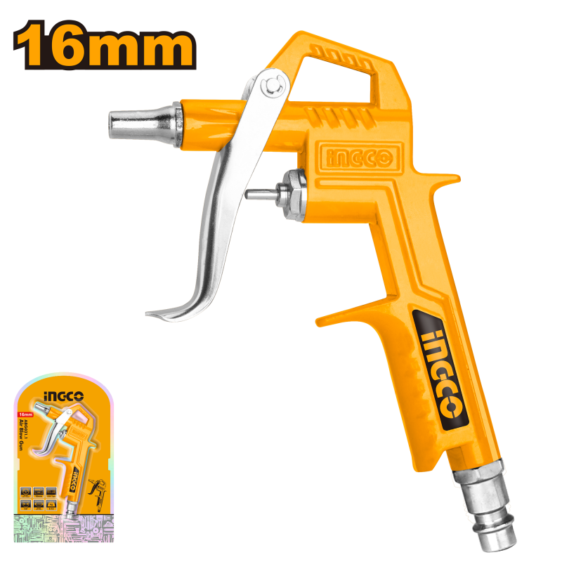 Descripción PISTOLA DE AIRE COMPRIMIDO INGCO P/SOPLETEAR 16 MM # ABG031.1 Boquilla: 16mm Presión de trabajo: 2 – 6.3 Bar (29 – 91.35 psi) Conexión: 1/4" Flujo de aire: 100-200 L/min (3.5 – 7 cfm) Peso: 0,12 kg