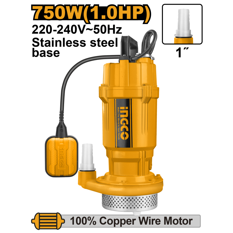 BOMBA SUMERGIBLE INGCO METALICA 750 WATTS - 1,0 HP #SPC7508 Tuberia diametro 1" Motor de alambre de cobre Cable 9m de longitud Base Tornillos y ejes de acero inoxidable Protección térmica Con interruptor de flotador Para agua limpia VOLTAJE: 220-240V~50Hz POTENCIA NOMINAL: 750W (1.0HP) FLUJO MÁXIMO: 120L/min CABEZA MÁXIMA: 32M