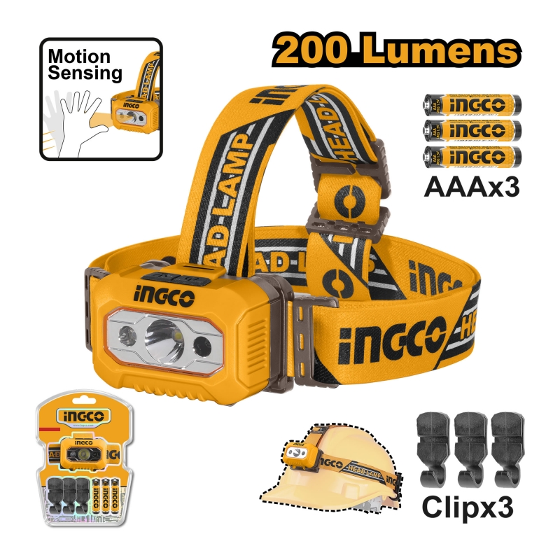 Descripción LINTERNA INGCO LED INDUSTRIAL P/CABEZA 3 PILAS AAA # HHL013AAA8 Brillo: Máx .: 200 lúmenes Bajo: 100 lúmenes Distancia máx. haz 91 m Resistente a la lluvia IPX4 Usa 3 pilas alcalinas AAA