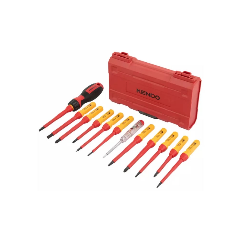 ATORNILLADOR KENDO PARA ELECTRICISTAS 1000VOLT 13 PZAS. #20485 4 pzs Carpintero: 1,2 x 6,5 x 100mm, 1 x 5,5 x 100mm, 0,8 x 4 x 100mm, 0,5 x 3 x 100mm 2 pzs Phillips: PH2 x 100mm, PH1 x 80mm 2 pzs Pozidriv: PZ2 x 100mm, PZ1 x 80mm 3 pzs Torx: T20 x 100mm, T15 x 100mm, T10 x 100mm 1 mango de destornillador 1 probador de voltaje de 3,0 x 140mm.