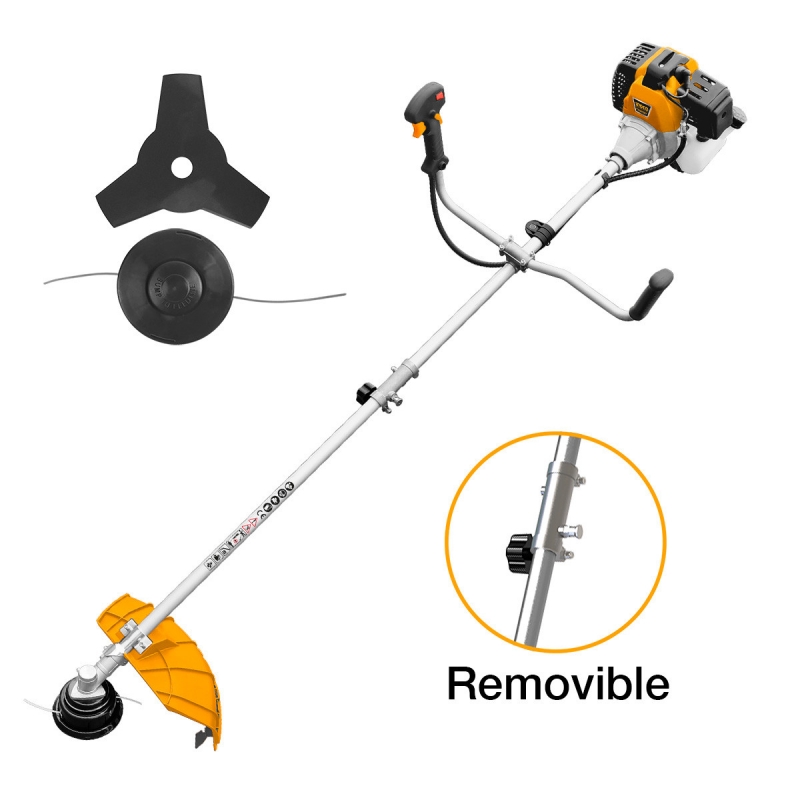 ORILLADORA DE PASTO INGCO A GASOLINA 42,7 CC 2HP #GBC5434421 POTENCIA NOMINAL: 1,25Kw (2HP) VELOCIDAD MÁXIMA: 9000 rpm VELOCIDAD RALENTÍ: 3100/4500 DIAMETRO DE HOJA: 255mm (3 dientes) CORTE MÁXIMO: 420 mm2 CARRETE: 2,4mm x 4 m CAPACIDAD DEL TANQUE: 1,2 L Valores de vibración en cada mango (m/S2): ≤9,3 Valores de presión sonora [dB(A)] (según EN 27917): ≤103 Valores de potencia sonora garantizados [dB((A) (según 2000/14/CE): ≤114 Línea máx. recorrido de corte / diámetro del hilo: 42 cm (Ø2,5 mm) Tipo de poste de aluminio: 2 piezas Peso seco (kg): 7,5 Tipo: Refrigerado por aire; 2 ciclos; válvula pistón vertical; motor de gasolina Salida máxima (k W /r/min)(según ISO 8893): 1,25/7500 Combustible utilizado: Gasolina mezclada con aceite lubricante (prop 40:01) Potente motor 2 tiempos Con 2 funciones: recortadora y cortadora Motor monocilíndrico refrigerado por aire