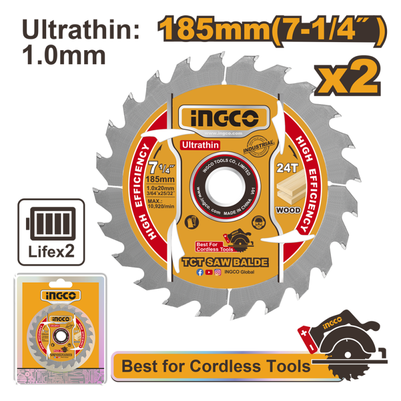 Descripción DISCO DE SIERRA CIRCULAR INGCO P/MADERA JGO.2 PZAS. 24 DTS. 185 MM-7.1/4" # TSB1853 Set de 2 piezas Adecuado para sierra circular de iones de litio CSLI1851 Ultra fina Mandril 20mm Anillo reducción: 16mm Espesor de la matriz 1,0mm